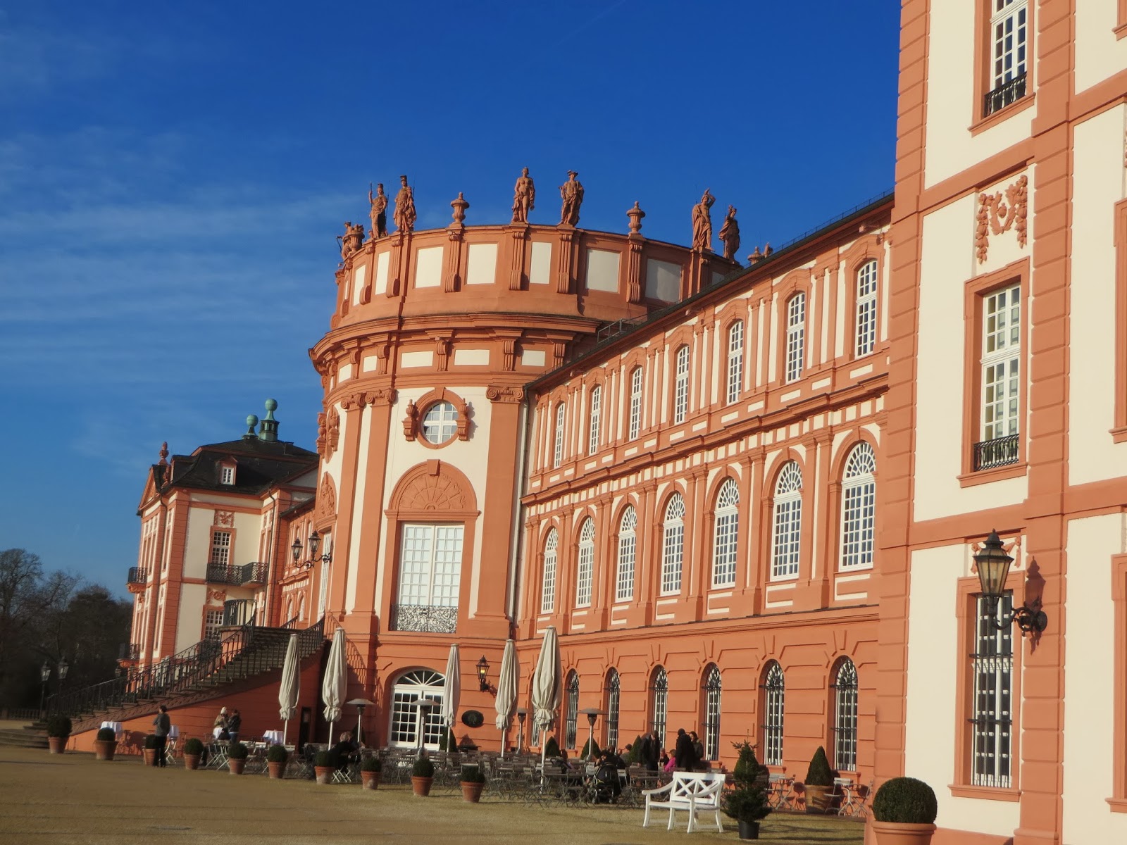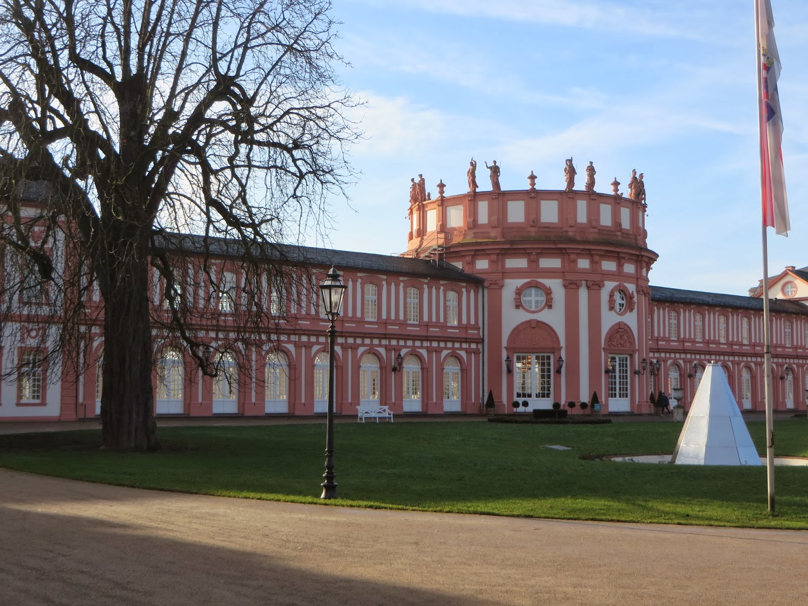 We are so fortunate to have our own neighborhood palace within a 30 minute walk from our home in Wiesbaden. This is the Biebrich Schloss or Palace and its construction began in 1688, when Count Georg August Samuel of Nassau-Idstein, apparently wanted a bit grander chateau overlooking the Rhine than his other palace in Idstein. It was completed in 1702 and Prince Karl von Nassau-Usingen took over in 1734 ,and expanded it. Unfortunately, it was heavily damaged by bombing in WW II, but since has been restored and now belongs to the state government of Hesse. In any case, it’s a wonderful place to enjoy a cappuccino on a crisp winter Sunday morning. The view overlooking the river traffic on the Rhine is beautiful.
